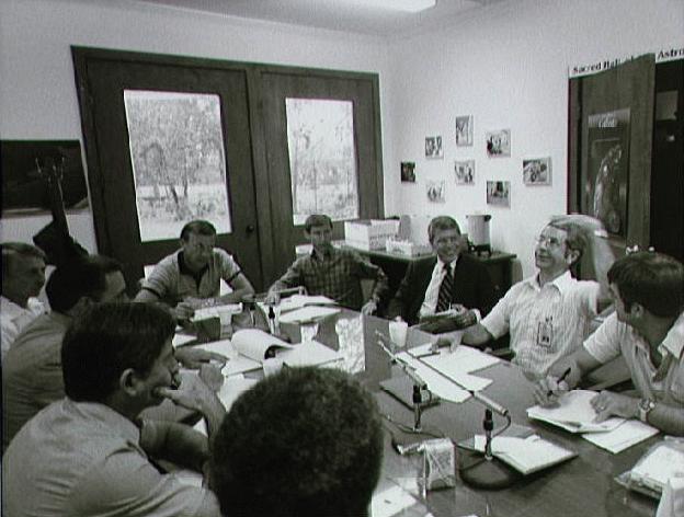 Description: STS-8 crew during debriefing. Pictured clockwise from lower right corner are Astronauts Guion S. Bluford (partially obscured), and John W. Young; Flight Crew Operations Director George W. S. Abbey; and Astronauts Owen K. Garriott, Paul J. Weitz, Brewster Shaw, Jr.; Robert A.R. Parker, Truly and Daniel C. Brandenstein