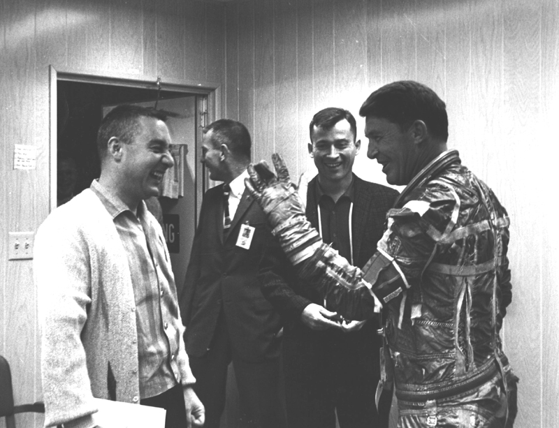 Astronauts Virgil I. (Gus) Grissom left and John W. Young have a good laugh on the morning of the GT-3 mission. Astronaut Walter M. Schirra Jr., command pilot for the backup crew greeted the two GT-3 crew members dressed in an old and somewhat battered training suit and told them, " In case either one of you don't want to go this morning, I'm your backup." The National Aeronautics and Space Administration's Gemini-3 three-orbit mission was successfully flown Tuesday, March 23.